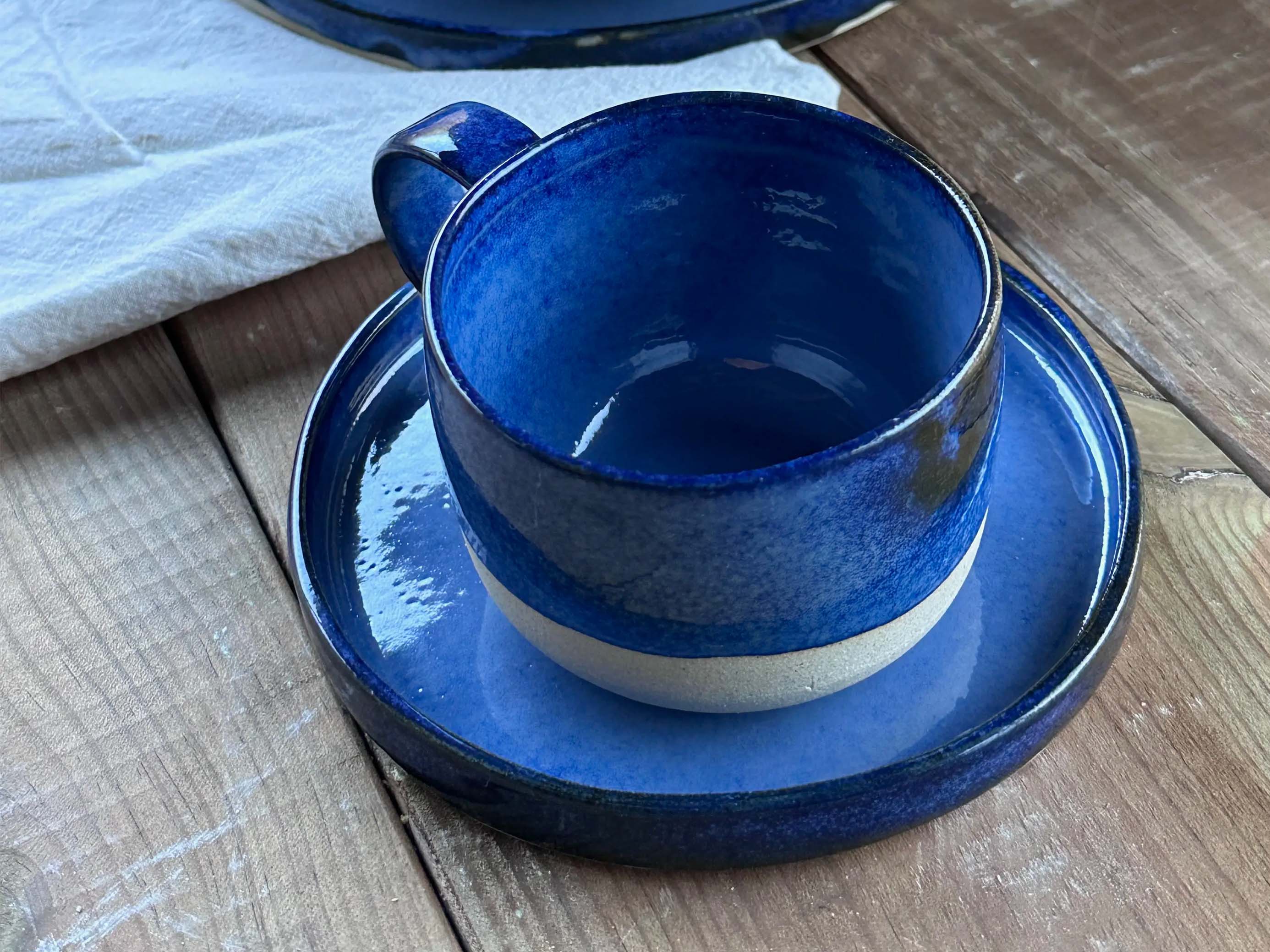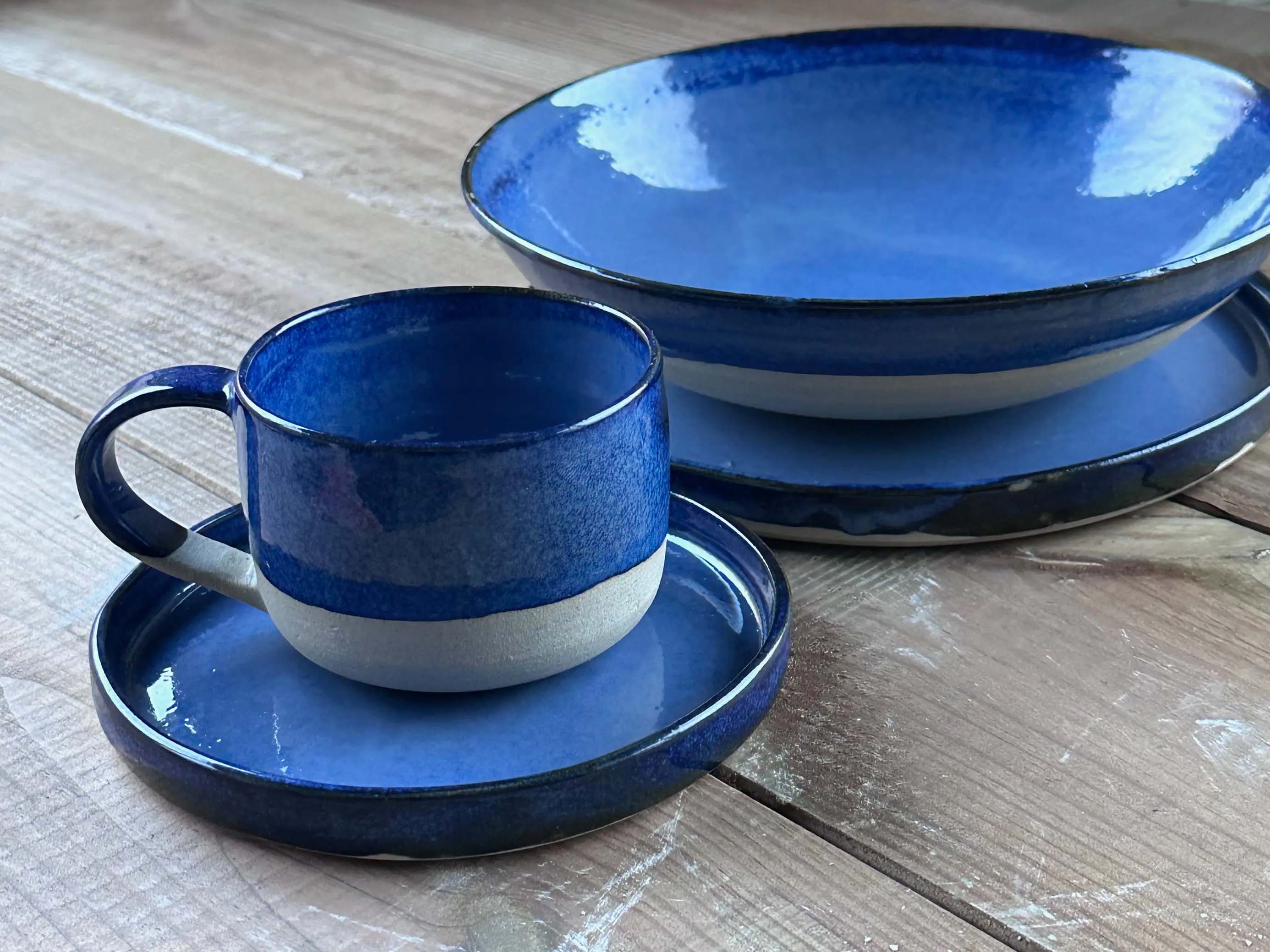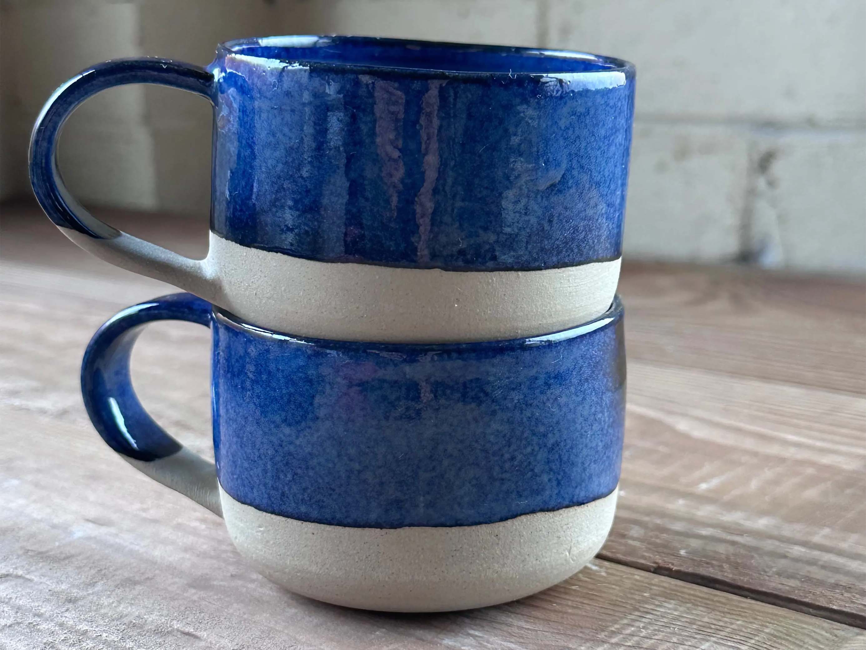 Comfortable to hold and steady in use, these cups are designed for daily rituals, from morning coffee to evening tea they are prefect for your favourite brew. Each one carries slight variations that reflect the making process. Made in a white stoneware clay. Available in three glaze options Blue, Green or Almond. W8 x D8 x H6 cm approx. product code BTC26